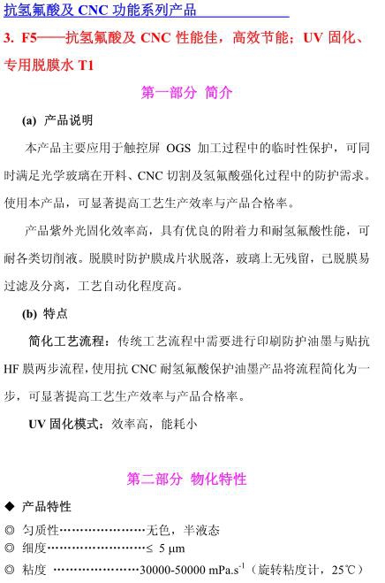 F5——抗氫氟酸及CNC性能佳,高效節能;UV固化、專用脫膜水固化、專用脫膜水T1