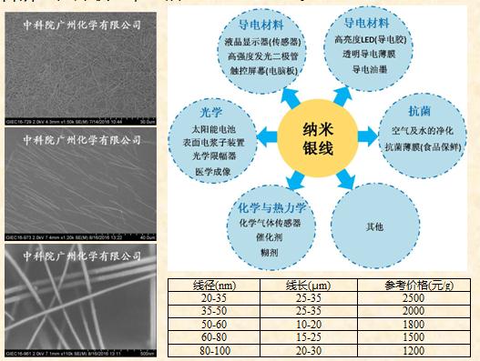 中科院廣州化學有限公司前身為成立于1958年的中國科學院廣州化學研究所,它是中國科學院在華南地區唯一的以應用研究和高技術創新為主的綜合性化學研發機構,也是中國科學院新型特種精細化學品技術與產業化聯盟的盟主單位。主要從事粘膠劑、涂料、化灌材料等環保型高分子材料、電子信息聚合物以及建材添加劑等精細化學品的研發、生產和銷售。公司與加拿大女皇大學合作,擁有納米銀線、導電油墨、導電銀漿和透明導電薄膜等材料的研發和生產,可以提供多種級別的納米銀線分散液等產品,銀納米線可選直徑有20-35nm35-50nm50-60nm60-80nm,80-100nm等,銀納米線長度可以根據客戶要求定制,溶劑可選去離子水、無水乙醇、異丙醇或客戶指定,濃度可為5mg/ml10mg/ml20mg/ml或客戶指定。一般供貨時間兩天以內,量多的話供貨時間待商榷。