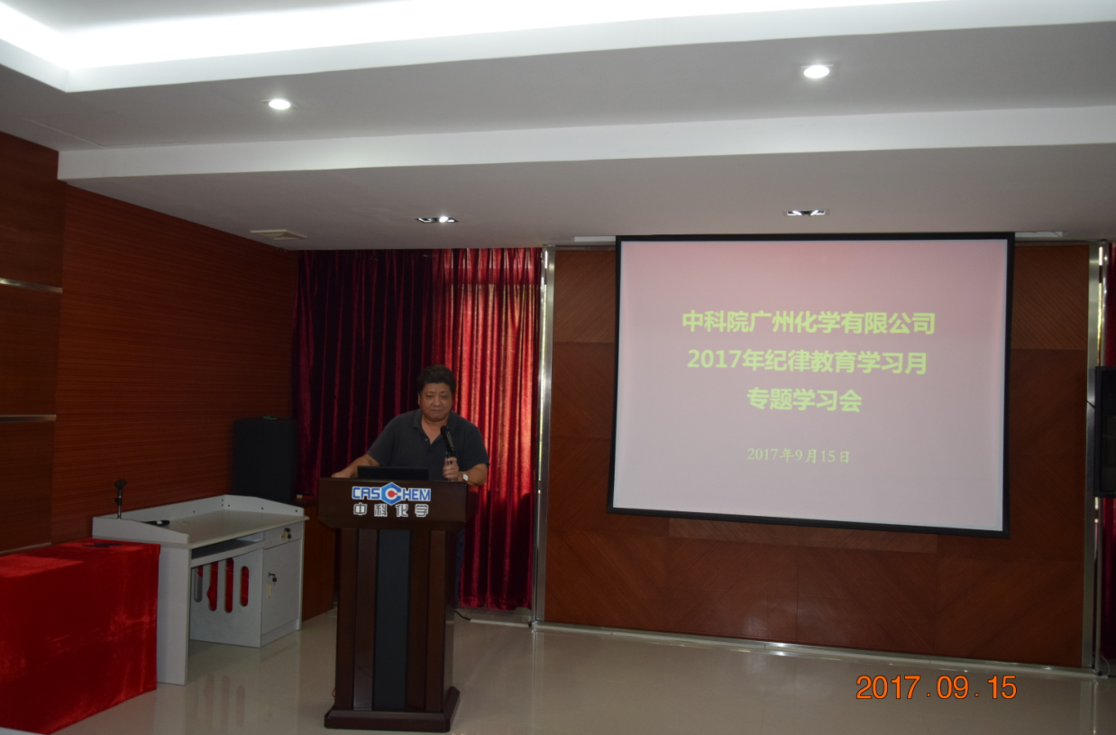 9月15日,中科院廣州化學有限公司(廣州化學)召開中心組會議,進行以“講政治、強黨性、嚴紀律、守規矩”為主題的紀律教育月學習活動。廣州化學中層及以上領導干部、黨委委員、紀委委員、全資及控股公司領導班子成員、在職黨支部書記、團委書記參加會議。