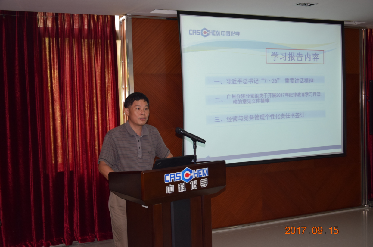 中心組成員在會前認真學習了反腐倡廉的相關材料,會上,廣州化學黨委副書記、紀委書記劉偉區作了紀律教育學習月專題輔導報告,傳達了習近平總書記“7·26” 重要講話精神和廣州分院黨組關于開展2017年紀律教育學習月活動的文件精神,他要求全體參會人員結合正在開展的“兩學一做”學習教育常態化制度化學習和此次紀律教育學習月活動能夠在工作和生活中將各項要求落到實處。