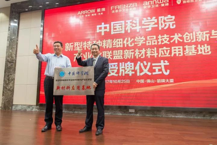 10月25日,在樂華集團箭牌總部大廈,舉辦了“中國科學院新型特種精細化學品技術創新與產業化聯盟(精細化學品聯盟)新材料應用基地”授牌儀式。國科控股董事、總經理索繼栓,中科院廣州化學有限公司(廣州化學)黨委書記、董事長胡美龍,廣東省建材協會會長吳一岳,樂華家居集團董事總經理謝岳榮等領導和嘉賓出席了授牌儀式。