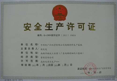 2015年3月23日,韶關市安全生產監督管理局向中科院廣州化學有限公司南雄材料生產基地核發了危險化學品安全生產許可證。