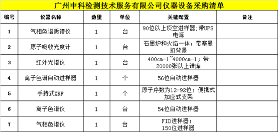 廣州中科檢測技術(shù)服務(wù)有限公司對本公司所需儀器設(shè)備進(jìn)行招標(biāo)采購。