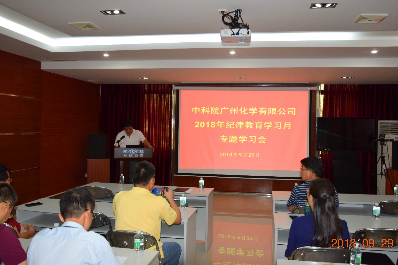 929日,中科院廣州化學有限公司(廣州化學)開展2018年紀律教育月專題學習活動。廣州化學中層及以上領導干部、黨委委員、紀委委員、全資及控股公司領導班子成員、在職黨支部書記、在職支部紀檢委員、團委書記共40多人參加會議。會議由公司黨委書記、董事長胡美龍主持。